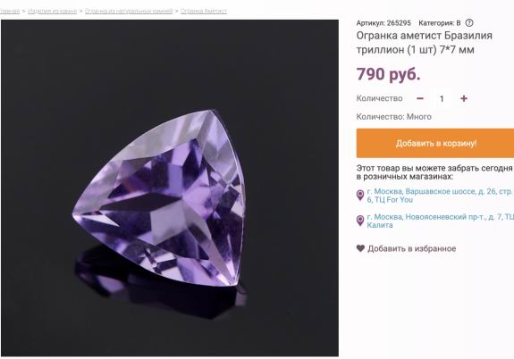 Мне для кольца нужен был аметист с огранкой триллион, в проверенных магазинах, которым я на 100 % доверяю и уверен, что там продают только природные камни, к сожалению нужных размеров не нашел.